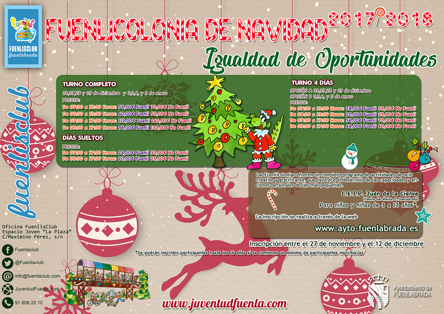 Un año más el Ayuntamiento, a través de la Concejalía de Juventud e Infancia, pone en marcha la Fuenlicolonia de Navidad en el colegio público Juan de la Cierva para que los padres y madres interesados/as puedan dejar a sus hijos/as durante el periodo de vacaciones, y así facilitarles la conciliación de la vida familiar y laboral. Está dirigida a niños/as de entre 3 y 12 años, aunque podrán inscribirse jóvenes de hasta 16 años con actividades específicas para ellos/as.