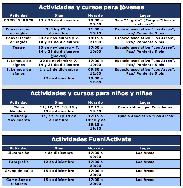 - Servicio SIJ+Garantía Juvenil – Del 30 de noviembre al 27 de diciembre traslada a su atención al público a la sede de FuenlisClub (C/Maximino Pérez S/N) en horario de 9:00 a 14:00 h.