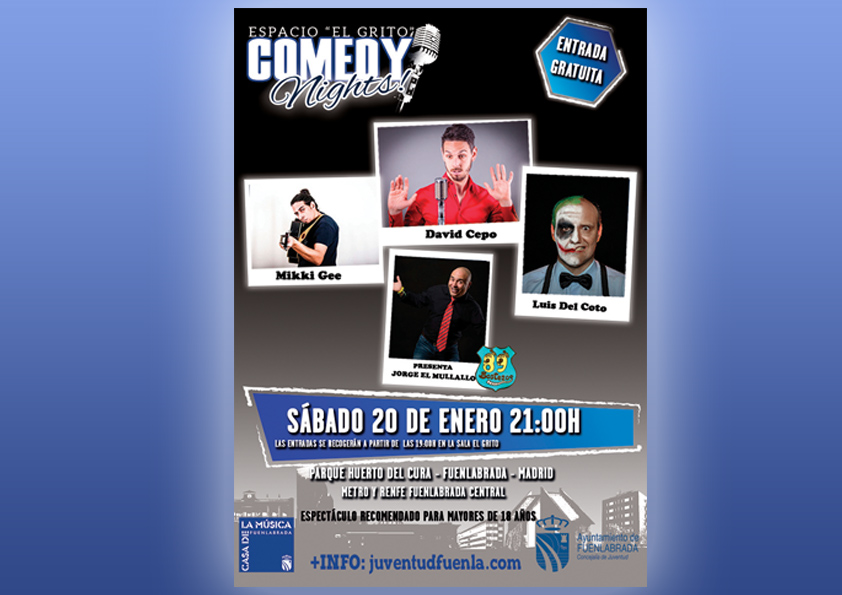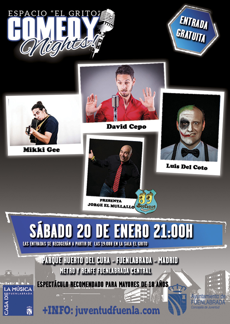 La Concejalía de Juventud a través de la Casa de la Música de Fuenlabrada trae una nueva propuesta de ocio, en esta ocasión se trata de un programa de humor en el que las risas estarán aseguradas. El estreno será el 20 de enero a las 21:00h en El Grito Parque del Huerto del Cura.