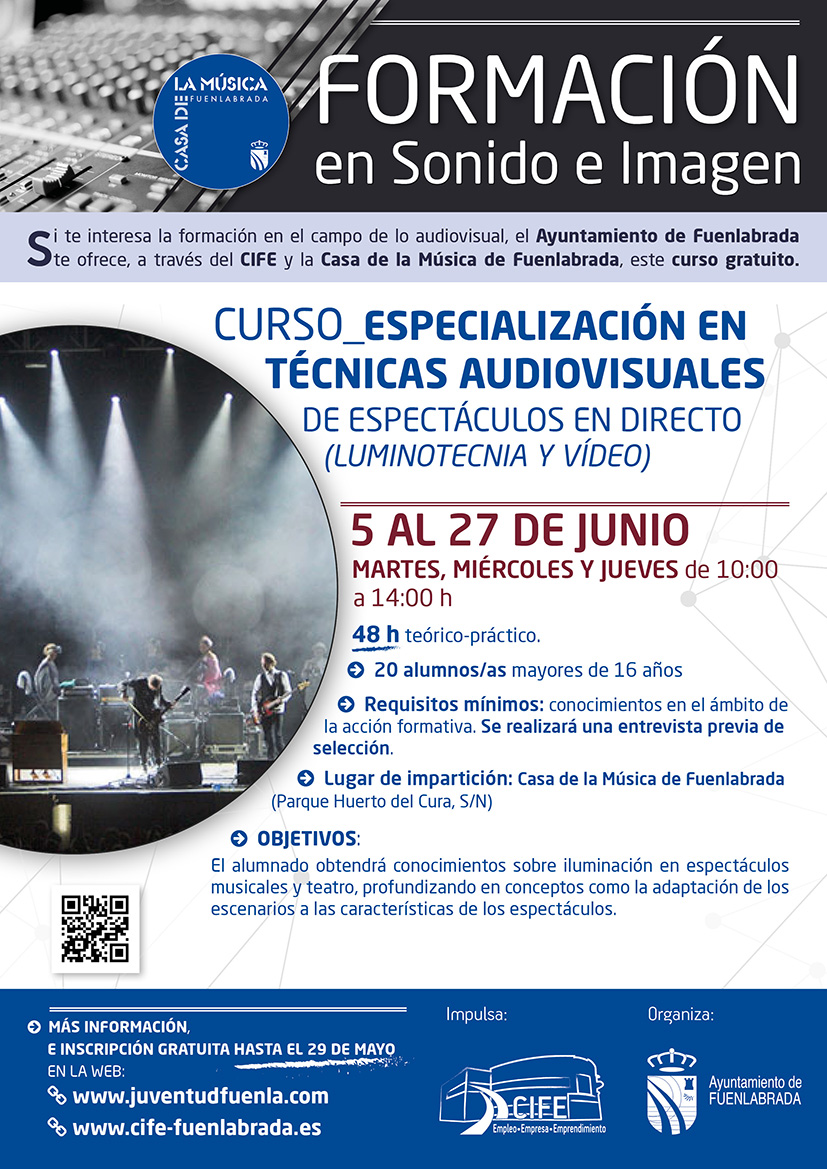 - Curso de especialización en técnicas audiovisuales de espectáculos en directo (luminotecnia y vídeo): Consta de 48 h. de formación a lo largo de las cuales el alumnado obtendrá conocimientos sobre iluminación en espectáculos musicales y teatro y profundizará en conceptos como la adaptación de los escenarios a las características de los espectáculos.