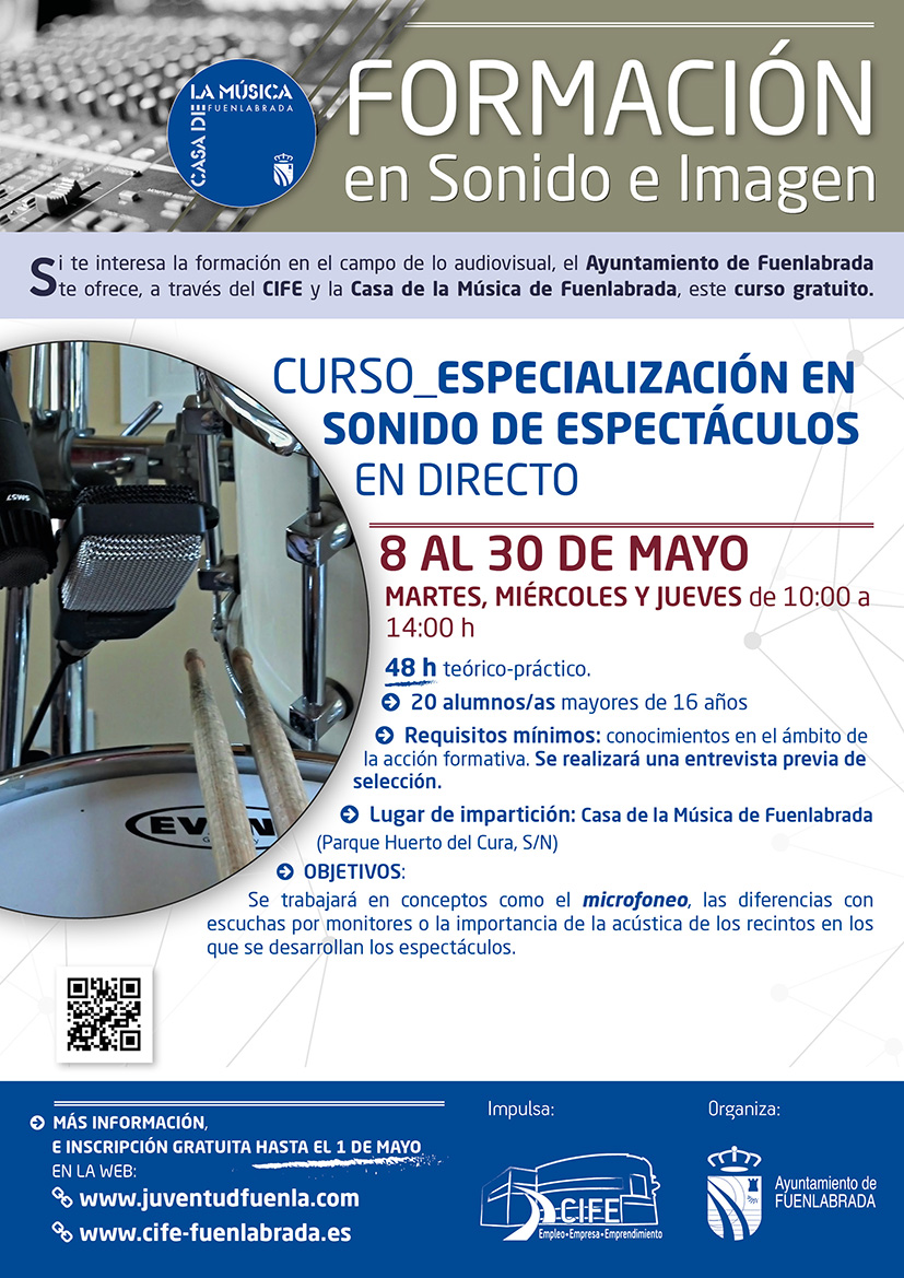 - Curso de especialización en sonido de espectáculos en directo: Consta de 48h. de formación a lo largo de las cuales se trabajará en conceptos como el microfoneo, las diferencias con escuchas por monitores o la importancia de la acústica de los recintos en los que se desarrollan los espectáculos.