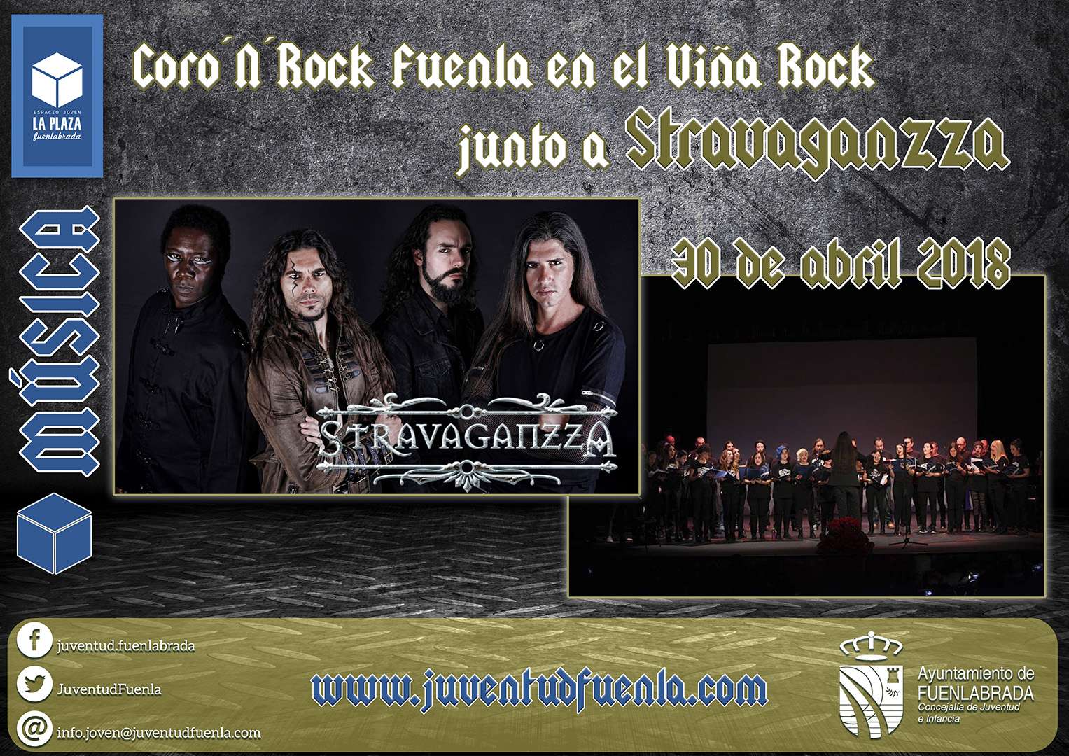 El próximo 30 de abril, el coro de la Concejalía de Juventud e Infancia, el Coro´N´Rock Fuenla que dirige el músico fuenlabreño Pepe Herrero, actuará en Villarrobledo dentro del Festival Viña Rock 2018 junto a la importantísima banda de metal sinfónico Stravaganzza. En los dos años que han pasado desde la creación del Coro, éste ha participado en multitud de eventos a nivel local tales como el Festival de Fantasía de Fuenlabrada, el Concierto Joven de las Fiestas Patronales o el Certamen de Música Moderna en versión local de Fuenlabrada. La actuación que tendrá lugar el 30 de abril supone un reconocimiento, a la vez que un gran impulso a la gran labor que están desarrollando los/as componentes del Coro.