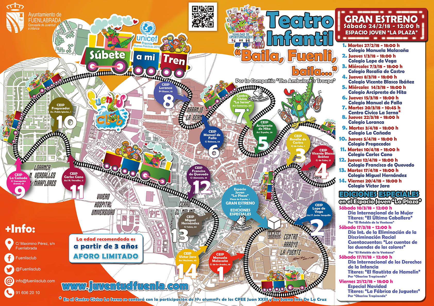Súbete a mi tren” es un proyecto de la Concejalía de Juventud e Infancia del Ayuntamiento de Fuenlabrada dirigido a niños, niñas y sus familias que tiene como objetivo ofrecer actividades de carácter participativo y cultural que combinen la diversión y el disfrute con la educación en valores y la sensibilización a través de la dinamización de espacios de referencia para la infancia de la ciudad (parques, barrios, colegios etc.). En 2018 FuenlisClub tiene como lema “Igualdad de oprtunidades” por lo que todas sus acciones trabajarán de manera transversal la inclusión y el respeto hacia la diversidad.
