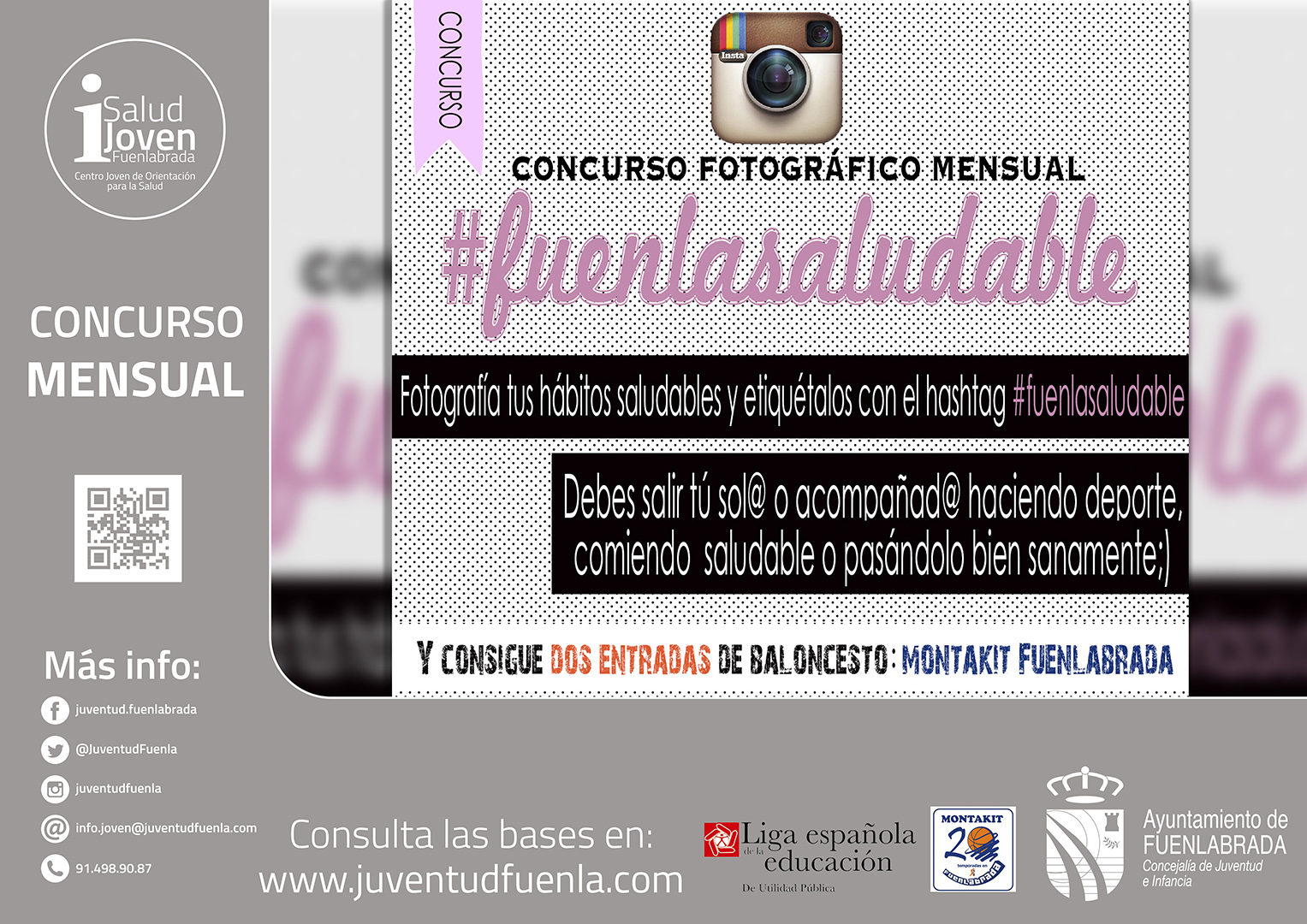 La Concejalía de Juventud e Infancia del Ayuntamiento de Fuenlabrada junto a la Liga Española de la Educación y con la colaboración del Club de Baloncesto Montakit Fuenlabrada organiza un concurso fotográfico en instagram con el título #fuenlasaludable.
