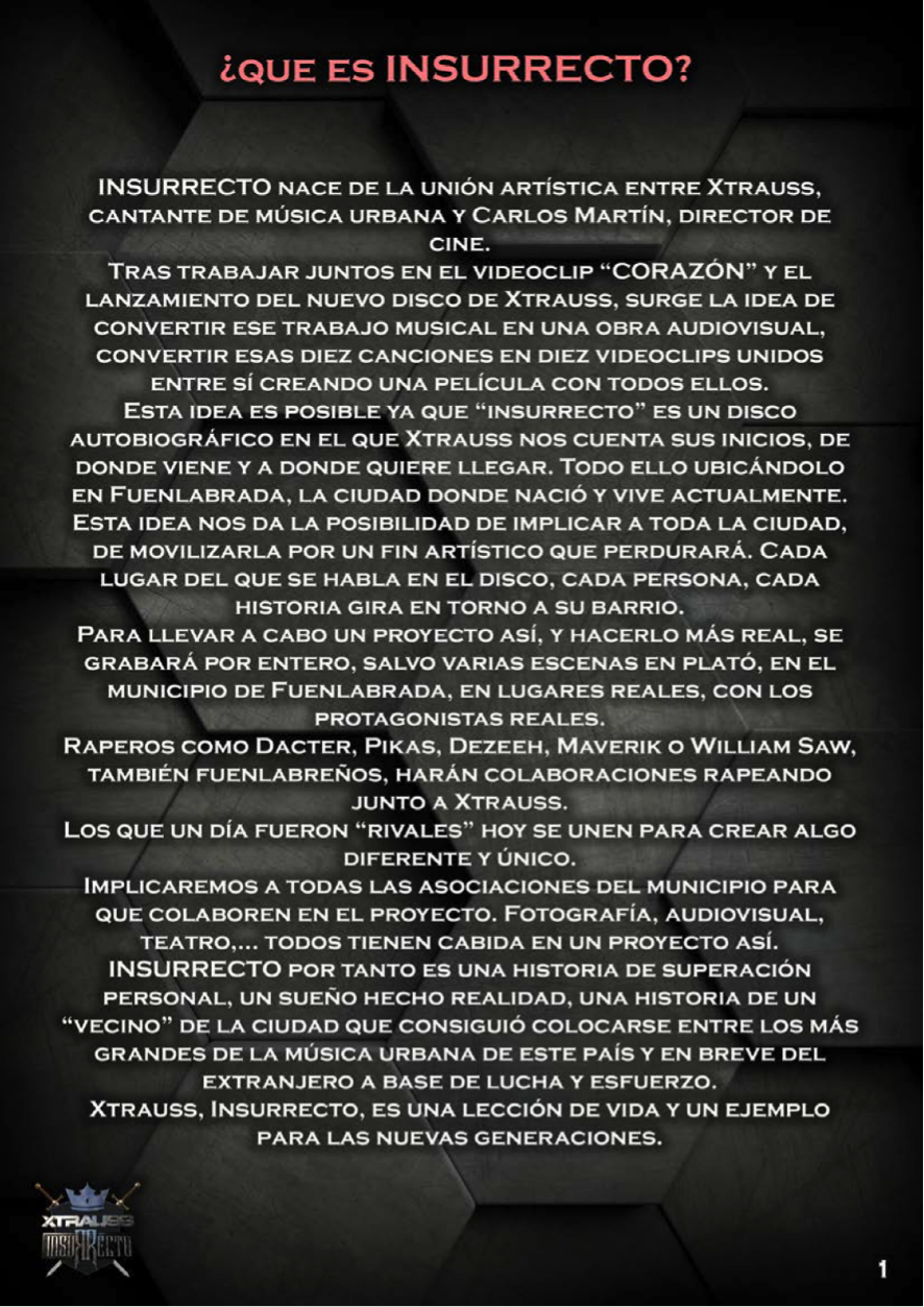 fusionándose con otras vertientes artísticas como la fotografía y el cine. Es un método pionero e innovador que sobrepasa la grabación de un videoclip para la promoción de un trabajo musical. ‘Insurrecto’ es la primera película que se produce en España cuya temática es la biografía de un artista. Además es el primer disco producido con carácter cinematográfico a nivel mundial y cuenta con la colaboración del Ayuntamiento de Fuenlabrada.