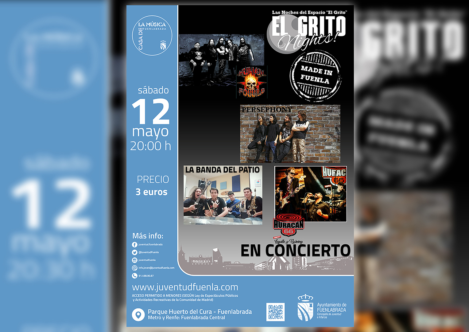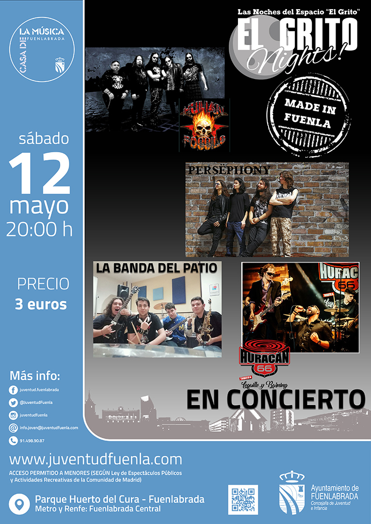 Sábado 12 de de mayo a a partir de las 20:00h una nueva edición del «Grito Nights» con un concierto Made in Fuenla, en el que actuarán las bandas Human Fossils, Huracán 66, La banda del patio y Persëphony.