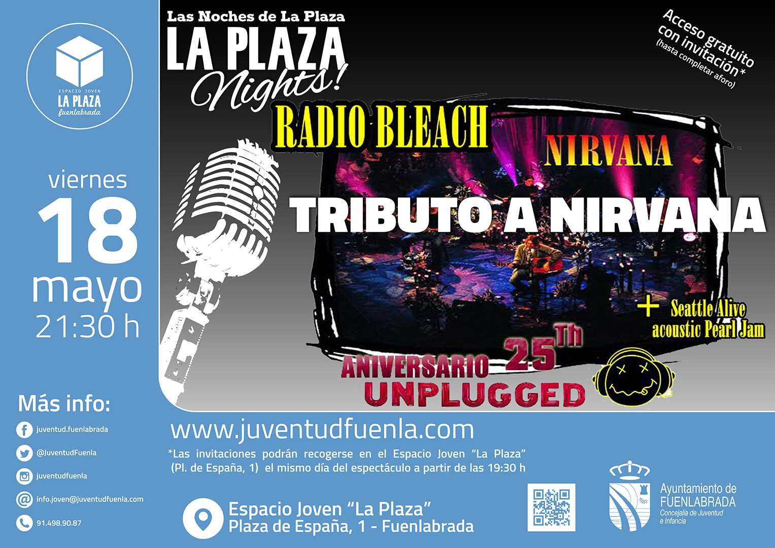 Las Noches de La Plaza lanza una nueva propuesta musical en esta ocasión un concierto acústico tributo a Nirvana de la mano de Radio Bleach, el viernes 18 de mayo a las 21:30h en El Espacio Joven La Plaza.