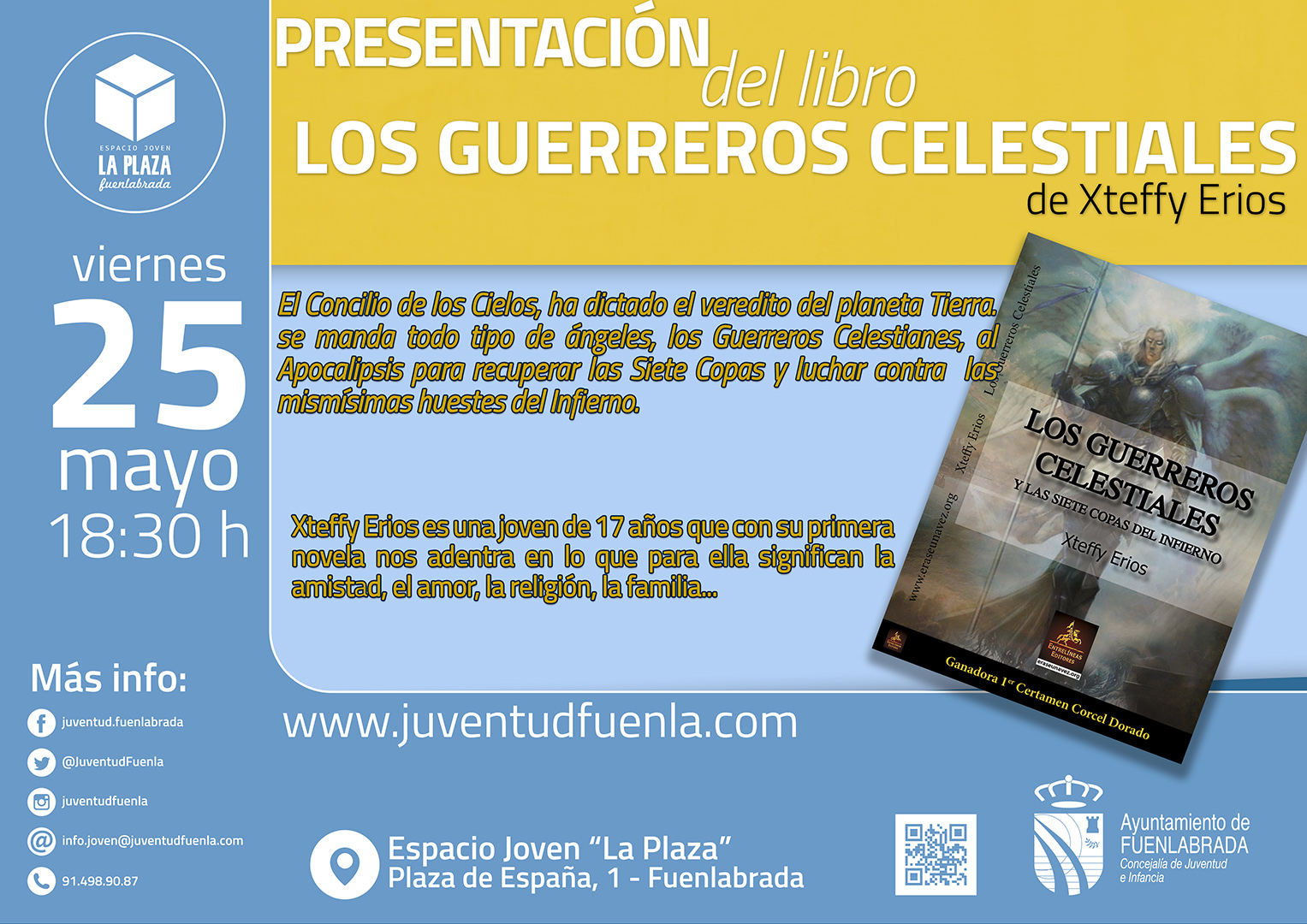 El próximo viernes 25 de mayo a las 18:30 horas la joven escritora Xteffy Erios presentará en el Espacio Joven «La Plaza» su primera novela «Los Guerreros Celestiales».