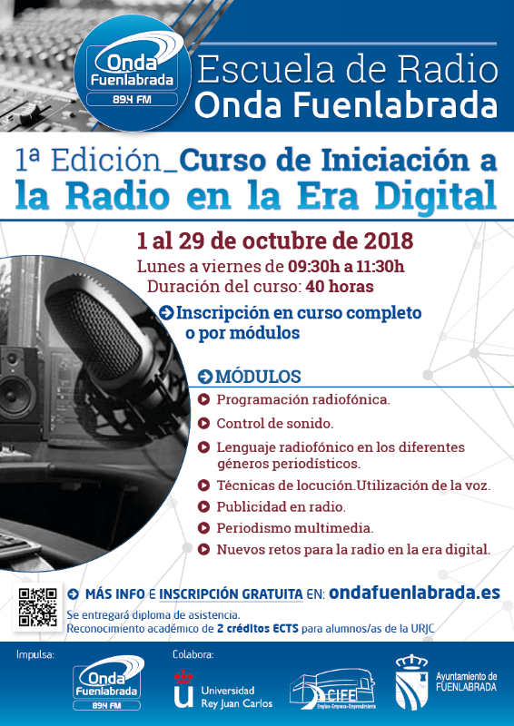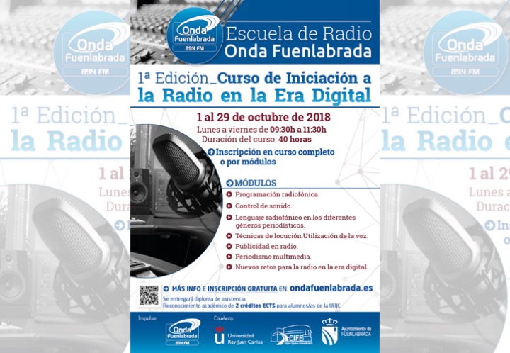 Si te apasiona la radio, si te gusta la magia de las ondas, tienes la oportunidad de poder realizar el Curso Iniciación a la Radio en la Era Digital, de forma gratuita en la Escuela de Radio de Onda Fuenlabrada del 1 al 28 de octubre. Un curso de cuarenta horas de duración diseñado en diferentes módulos que hace posible que puedas realizarlo de forma completa o asistiendo a los módulos que más te interesen.