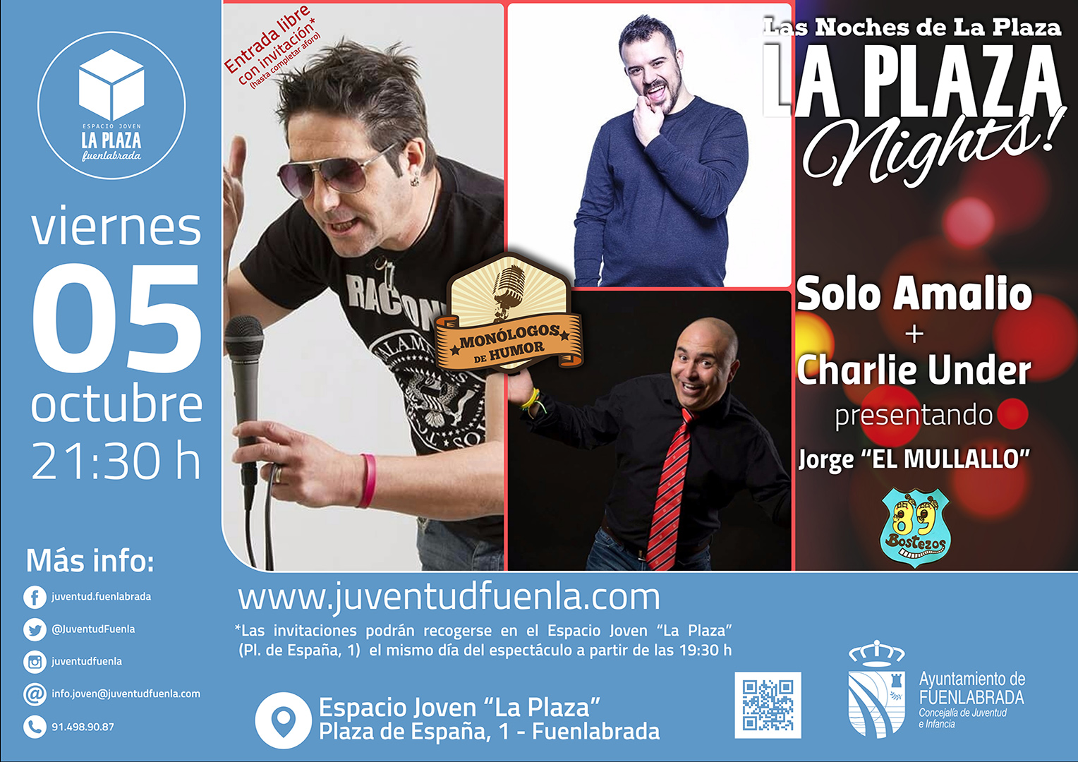 Vuelve la programación del programa de ocio cultural Las Noches de La Plaza, con un cartel de lujo para la primera noche de monólogos de la temporada. No te pierdas las actuaciones de Solo Amalio, Charlie Under y nuestro veterano maestro de ceremonias Jorge «El Mullallo».