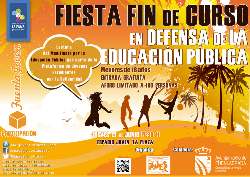 Con motivo de la finalización del curso escolar, la Plataforma de Jóvenes Estudiantes por la Solidaridad PJES, llevará a cabo una fiesta de fin de curso para todos y todas los/as jóvenes de nuestro municipio, menores de 18 años, cuya temática será la defensa de la Educación Pública.