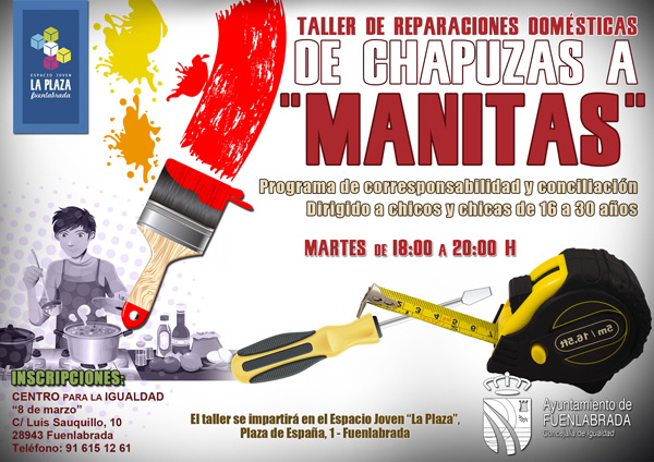 Un taller «DE CHAPUZAS A «MANITAS», para aprender conocimientos en electricidad, pintura, carpintería, etc., y realizar pequeñas reparaciones domésticas. Este taller se imparte los Martes de 18:00 a 20:00 horas.