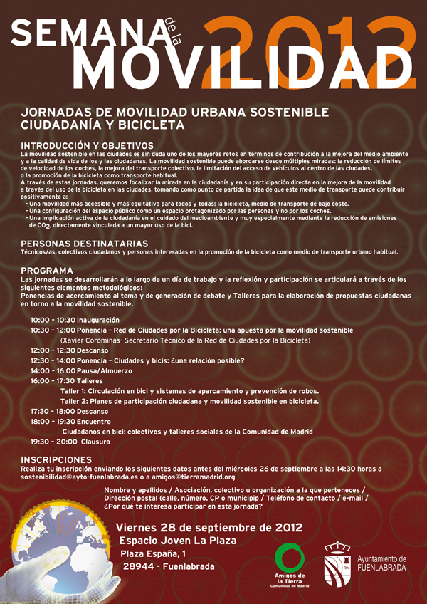 En el marco de la semana de la movilidad 2012, el Ayuntamiento de Fuenlabrada junto a Amigos de la Tierra, organizan para el próximo viernes 28 de septiembre las Jornadas de Movilidad Urbana Sostenible ‘Ciudadanía y Bicicleta’.