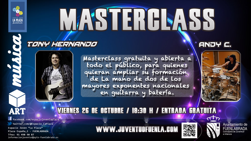 MasterClass gratuita y abierta a todo el público, para quienes quieran ampliar su formación de la mano de dos de los mayores exponentes nacionales en guitarra y batería: Tony Hernando (guitarra) y Andy C. (batería).