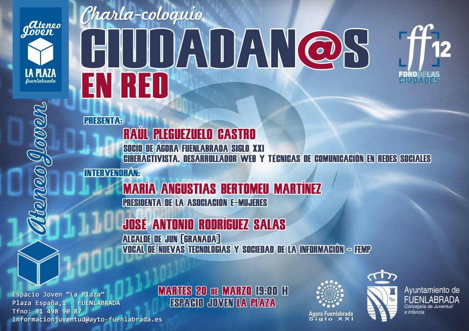 Ateneo Joven: «Ciudadan@s en Red», charla-coloquio organizada por Ágora Fuenlabrada Siglo XXI en colaboración con la Concejalía de Juventud e Infancia del Ayuntamiento de Fuenlabrada. Tendrá lugar en el Espacio Joven la Plaza, el próximo martes 20 de marzo a las 19:00 horas.