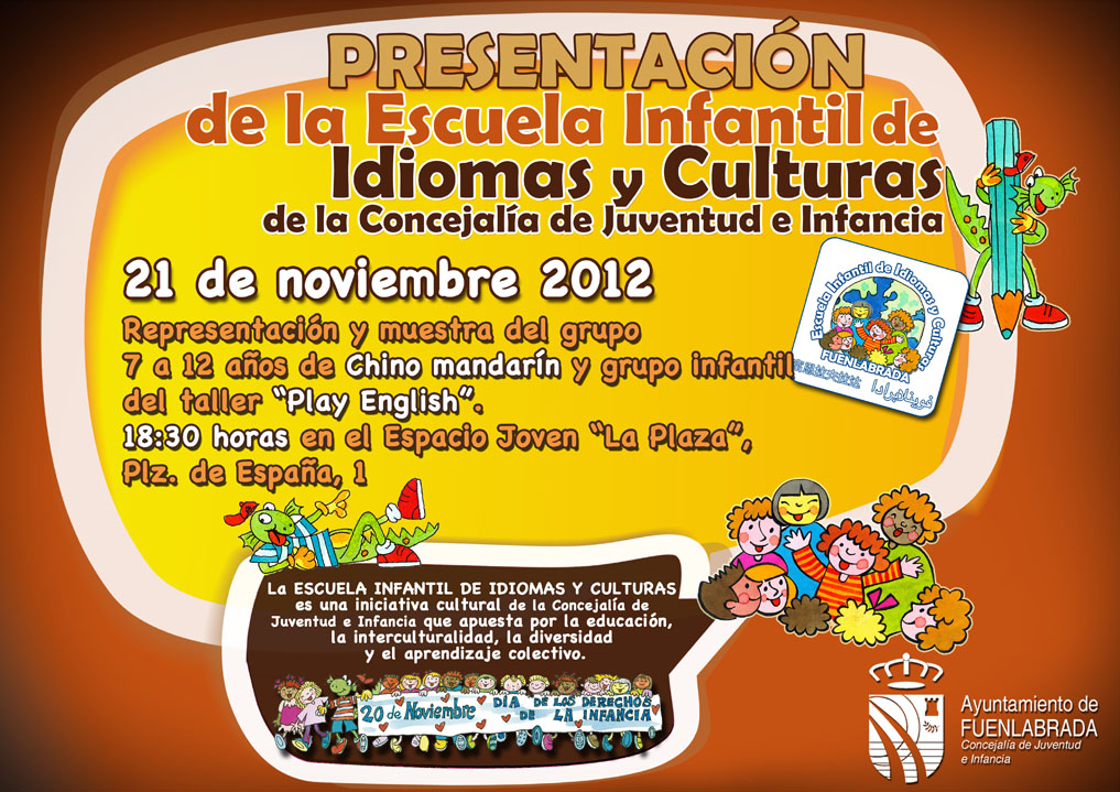 El próximo miércoles 21 de Noviembre a las 18:30 h en el marco de la programación desarrollada por el Ayuntamiento de Fuenlabrada con motivo de la Día internacional de los Derechos de la Infancia y la Adolescencia, se presentará en el Espacio Joven “La Plaza” el nuevo proyecto de la Concejalía de Juventud e Infancia “ESCUELA INFANTIL DE IDIOMAS Y CULTURAS”.
