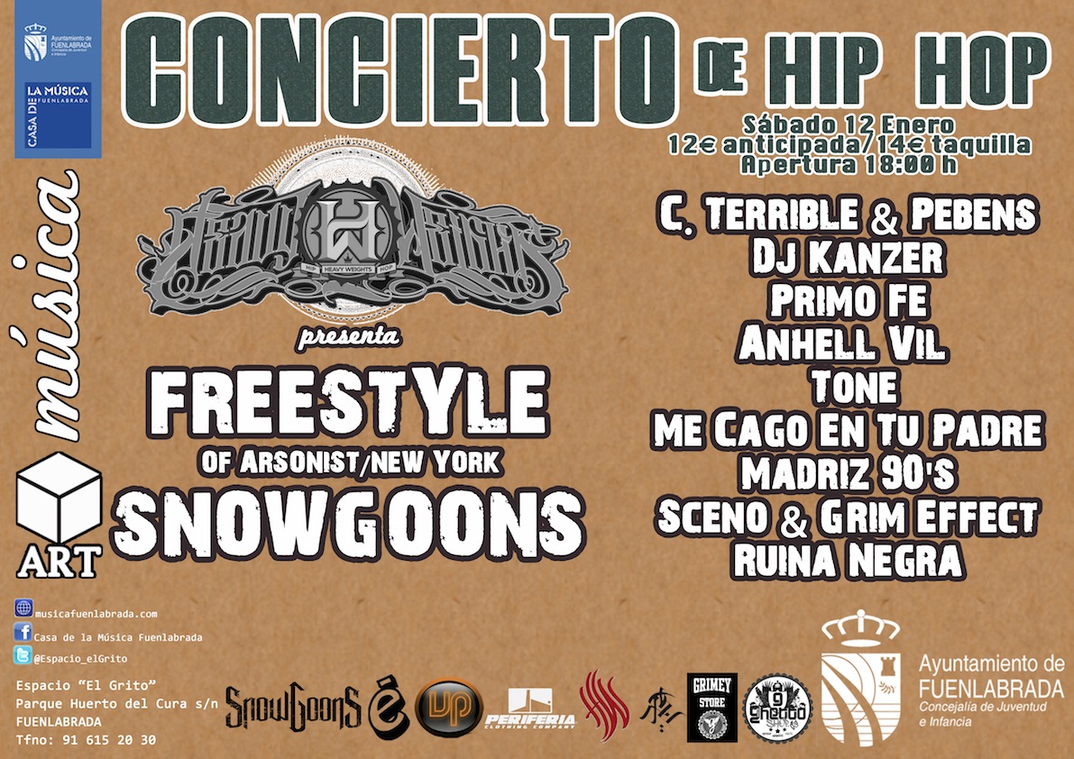 En esta ocasión organiza un concierto en el Espacio «El Grito”, dentro de las instalaciones de la Casa de la Música de Fuenlabrada. El concierto contará con actuaciones de grupos internacionales como Freestyle, del legendario grupo Arsonist o Snowgoons y las destacadas actuaciones de los artistas de la escena madrileña como Celedonio Terrible & Pebens, Dj Kanzer, Primo Fe / Anhell Vil, Tone, Me cago en tu Padre, Madriz 90’S, Sceno & Grim Effect y Ruina Negra.