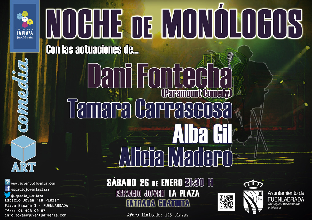 El próximo sábado 26 de enero a las 21:30 horas tendrá lugar una nueva edición de “Noche de Monólogos” en el Espacio Joven la Plaza. En el show intervendrán varios cómicos y la entrada será gratuita hasta completar el aforo (125 personas).