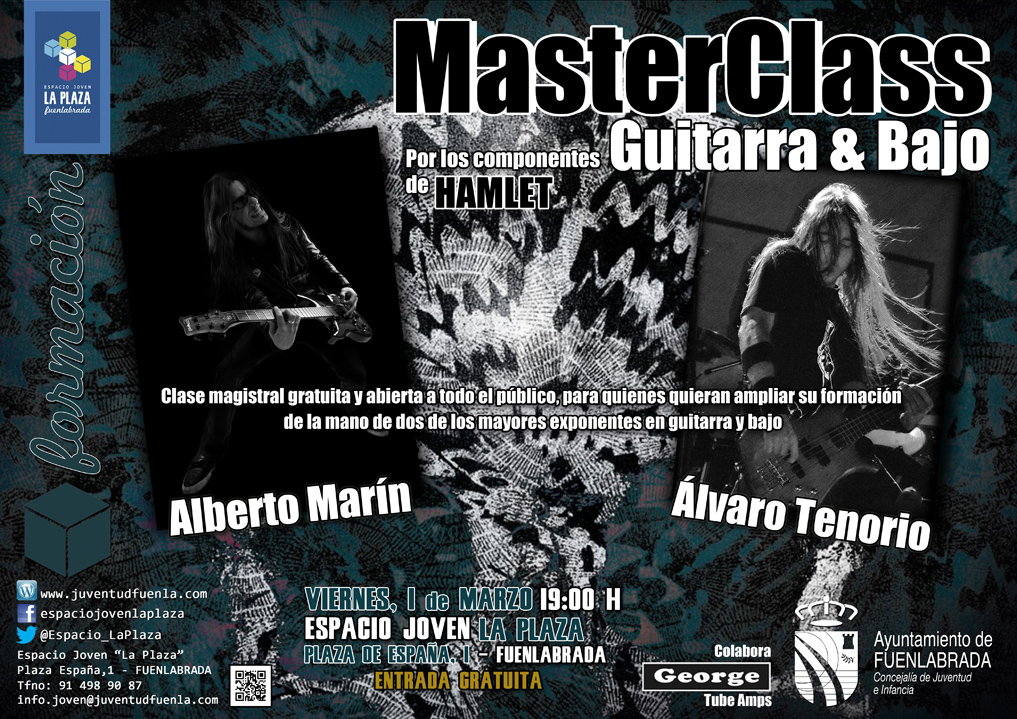 Dos de los profesionales más reconocidos de la escena metalera española e internacional se acercarán al Espacio Joven La Plaza para dar una lección magistral (master class) COMPLETAMENTE GRATUITA y ABIERTA PARA TODOS LOS PÚBLICOS. Los dos miembros actuales de la banda HAMLET estarán dando la masterclass a partir de las 19:00 h.