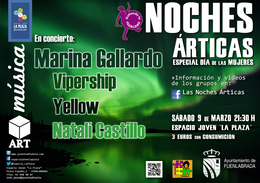 RT @JuventudFuenla: Sábado 9 de marzo “Noches Árticas” Conciertos en Acústico. Especial Día de las Mujeres https://t.co/ho9R40CgHh #Fuenl …