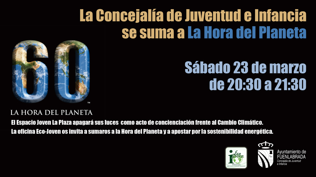 Desde la Concejalía de Infancia y Juventud queremos sumarnos a la Hora del Planeta que se celebra este sábado 23 de marzo de 20:30 a 21:30 horas. Por ello el Espacio Joven La Plaza apagará sus luces durante esta hora como acto de concienciación frente al Cambio Climático.