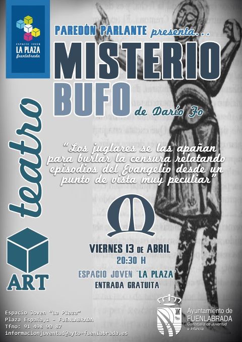 El próximo viernes 13 de Abril a las 20:30 horas, TeatroJoven con la Compañía Paredón Parlante presentando «Misterio Bufo» de Darío Fo, en el Espacio Joven La Plaza.