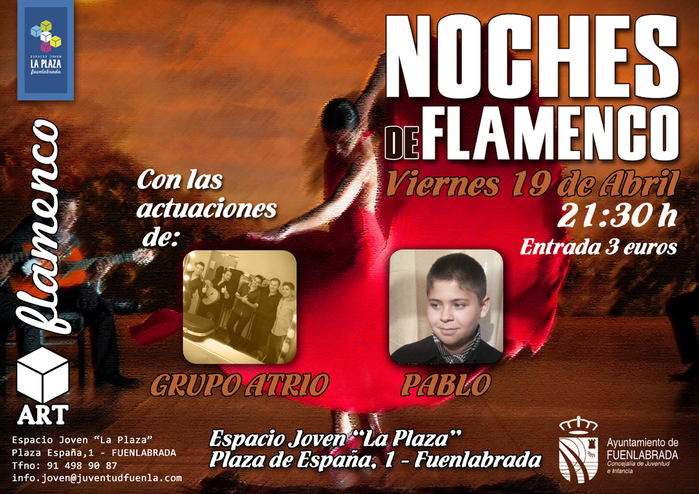 La Concejalía de Juventud e Infancia ha preparado una noche de flamenco en la que los/as asistentes podrán disfrutar de las actuaciones del Grupo Atrio y del cantaor Pablo acompañado a la guitarra por Manuel Postigo.