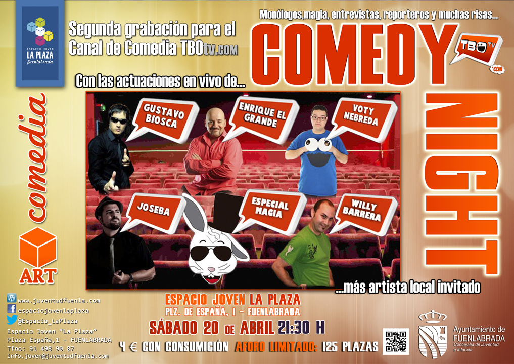 El próximo sábado 20 de Abril a las 21;30h, las puertas del Espacio Joven La Plaza se abren al público fuenlabreño para poder presenciar la segunda grabación para el canal del comedia online TBOTv.com.