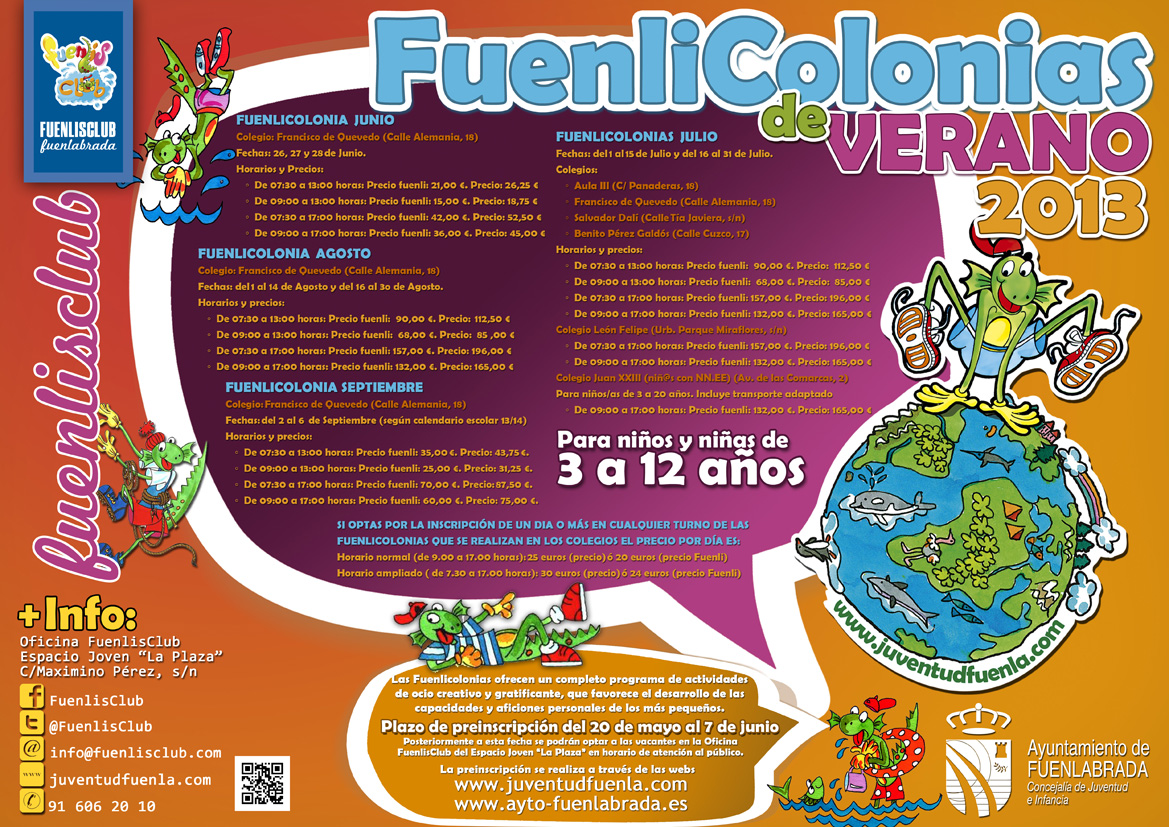 El próximo viernes 7 de junio finaliza el plazo de inscripción de la Campaña de Verano 2013 en la que el Ayuntamiento de Fuenlabrada junto a diversas entidades del municipio, ofrece distintas alternativas durante este verano para niños/as y jóvenes con edades comprendidas entre los 3 y 16 años. (20 años en el caso de la F. Juan XXIII).