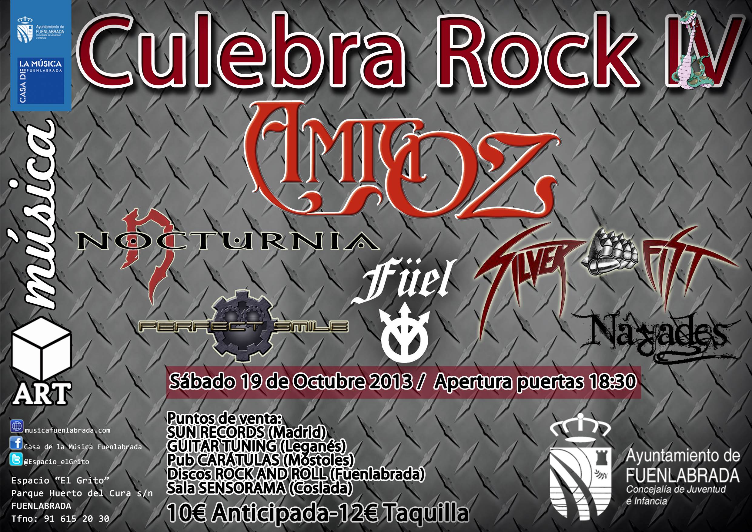 Como cada año el Culebra Rock acercará a la Casa de la Música de Fuenlabrada una tarde-noche de rock en la que intervendrán bandas legendarias y grupos nóveles de la ciudad. En esta edición contaremos con la presencia de los grupos AmigOz, Silver Fist, banda del mítico cantante de Muro, Nocturnia que saltó a la fama por ser el grupo de Rafa Carpena antes de ganar el concurso La Voz, Füel, Perfect Smile y Náyades y alguna sorpresa de última hora para dar más emoción al festival.