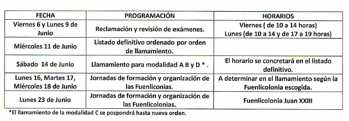 – El sábado 14 se realizara el llamamiento para cubrir las vacantes de las Fuenlicolonias en las modalidades A, B y D que se realizarán entre el periodo comprendido de Julio a Septiembre de 2014.