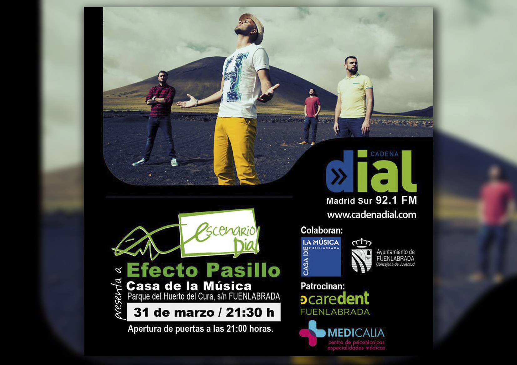 El jueves 31 de marzo a las 21:30h Efecto Pasillo actuará en Escenario Dial Fuenlabrada en El Espacio El Grito de la Casa de la Música, interpretando los temas de su último álbum «Tiembla la tierra»(junio 2016) en un formato íntimo y exclusivo. El concierto, que arrancará a las 21:30h., está organizado por Cadena Dial Madrid Sur 92.1 FM, con la colaboración de la Casa de la Música y la Concejalía de Juventud del Ayuntamiento de Fuenlabrada.