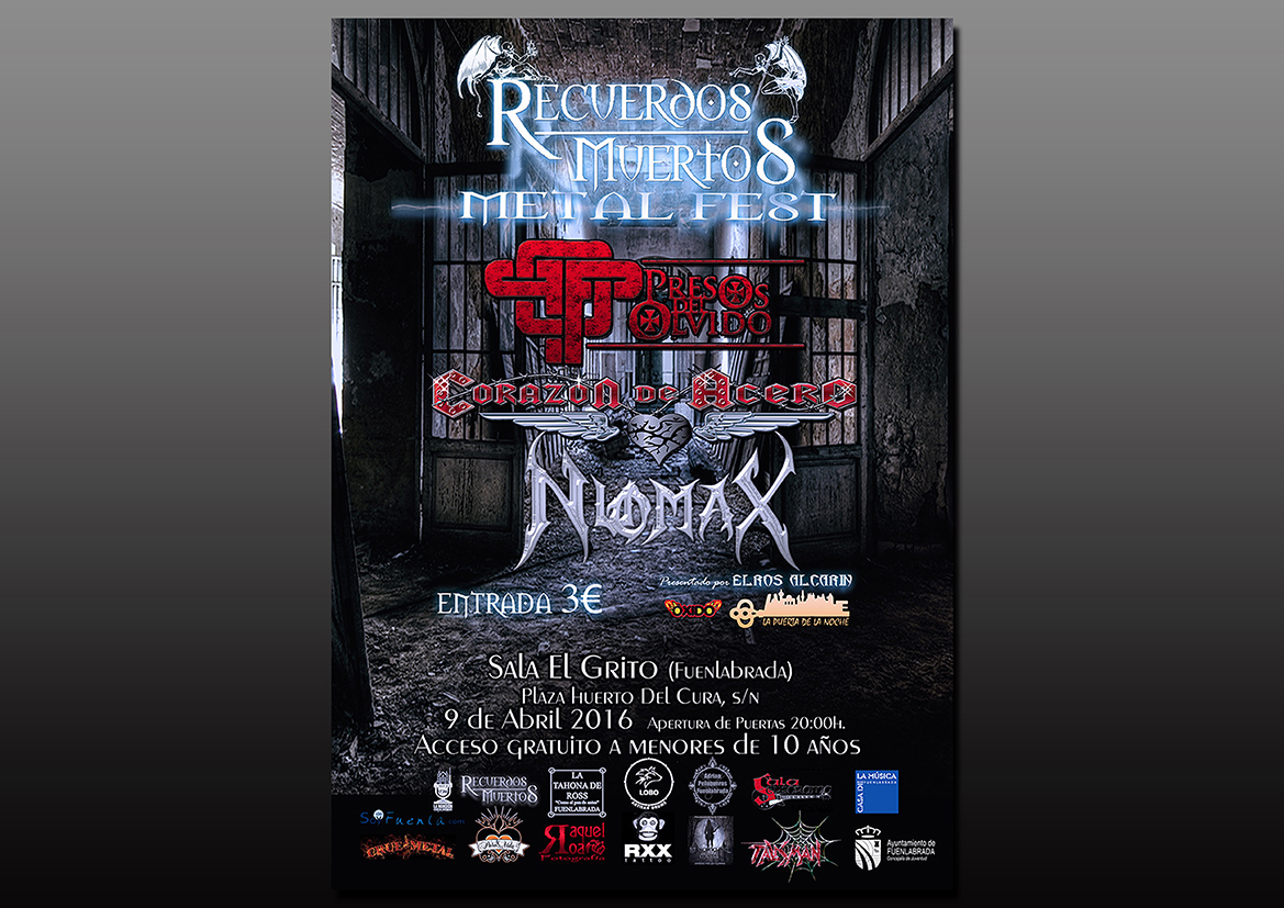 El «Recuerdos Muertos» Metal Fest se celebrará el sábado 9 de abril en el Espacio El Grito desde las 20:00h. Por primera vez en el mismo escenario actuarán Nuomax, Corazón de Acero y Presos del Olvido, y nos harán disfrutar de una noche de rock metal. Y si fuese poco, Elros Alcarín, afamado locutor del programa “La Puerta de la Noche” de Jin Radio Oxido Channel, hará de maestro de ceremonias, presentando este espectacular acontecimiento.